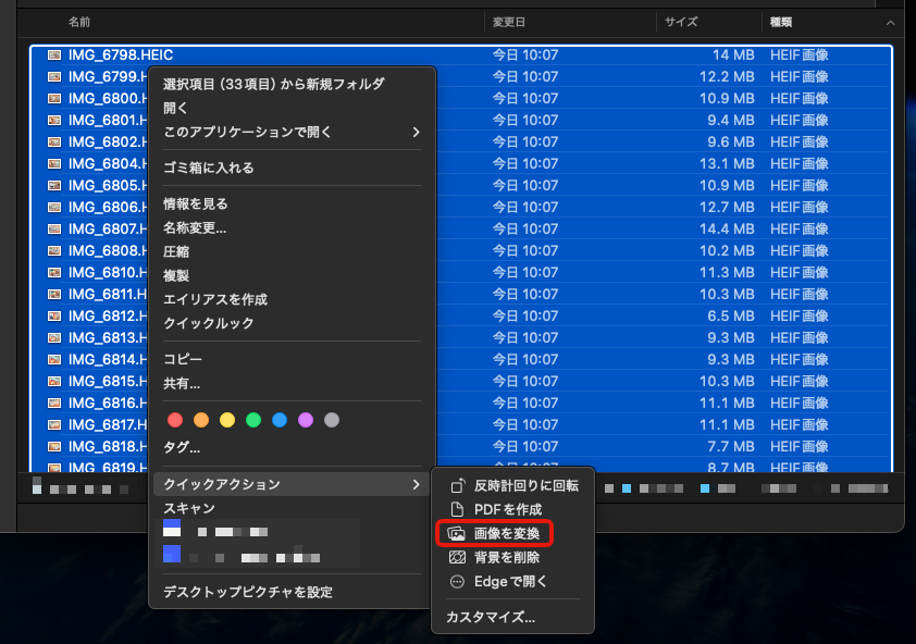 右クリック(または Control + クリック)してクイックアクション → 画像を変換