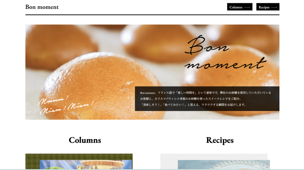 フジ日本株式会社様・糖類事業部の特設サイト「Bon moment」を制作しました。名称はフランス語で“楽しい時間を”の意。砂糖製品をご活用中の企業・店舗への取材記事と、パティシエ考案のスイーツレシピを一つのハブで発信し、製品の活用シーンと魅力を生活者目線で伝えます。