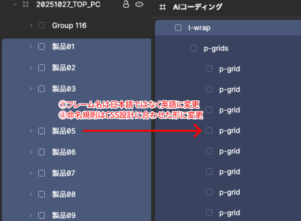 フレームの命名が日本語や適当だと、AIがデザインの構造を正しく理解できず、出力の精度が下がってしまいます。命名規則は諸説ありますが、今回はCSS設計のFLOCSSに合わせてリネームしました。