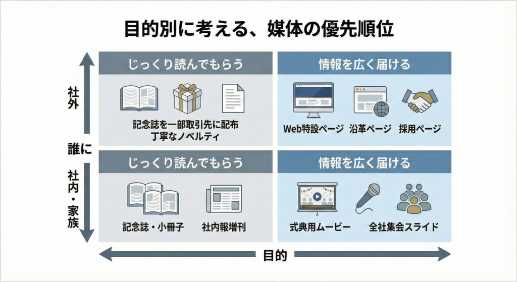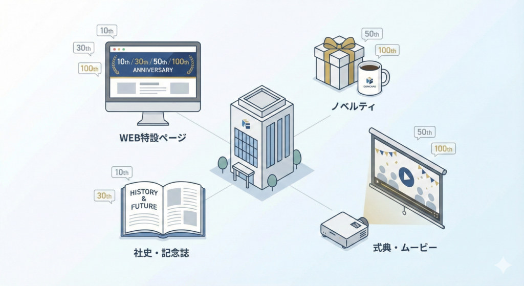 Webだけでなく、必要に応じて紙の記念誌や社内報、式典用のスライドや動画などに展開しておくと、取引先や採用候補者、社員とその家族に向けても、長く活躍してくれるコンテンツになります。