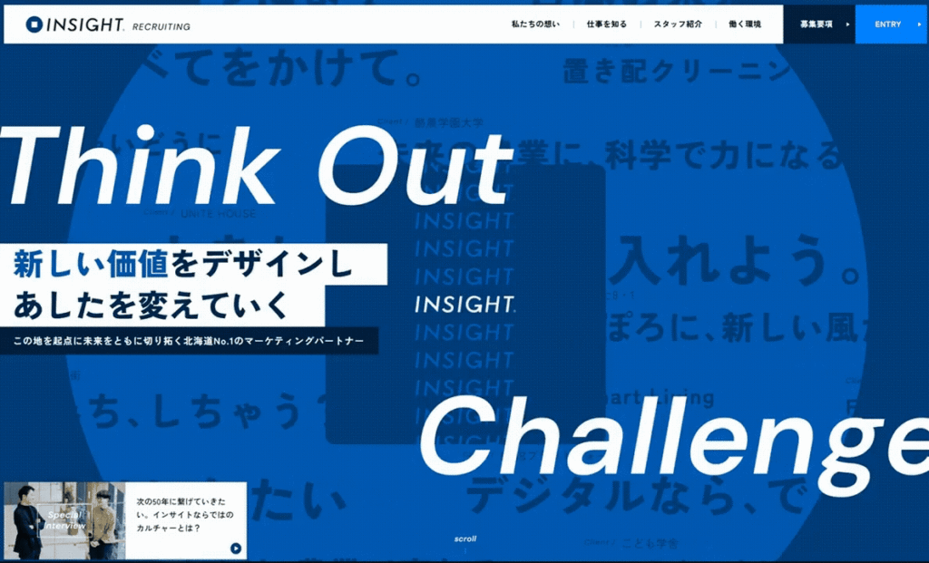 札幌を拠点に、地域密着型のマーケティングを展開する株式会社インサイト様の採用サイトリニューアルを担当しました。