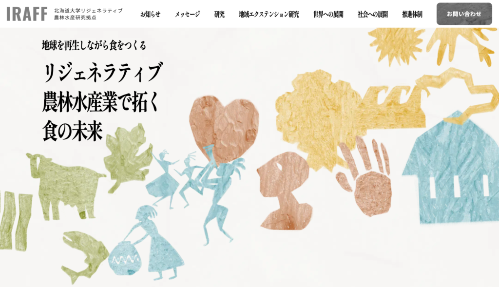 「環境を守り育てながら食をつくる」システムの実現を目指す、北海道大学リジェネラティブ農林水産研究拠点(IRAFF)の公式サイトの立ち上げを担当しました。