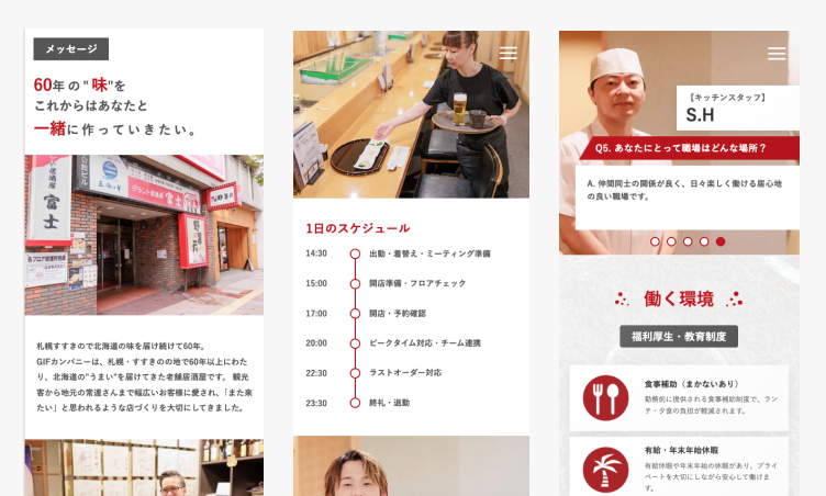 また、福利厚生の充実度や働きやすさといったグランド居酒屋富士の魅力を具体的に伝えるため、実際に働くスタッフの声を豊富に掲載。制度や環境だけでなく、“人”を通して職場の雰囲気やリアルな働き方を感じ取れる構成としています。
