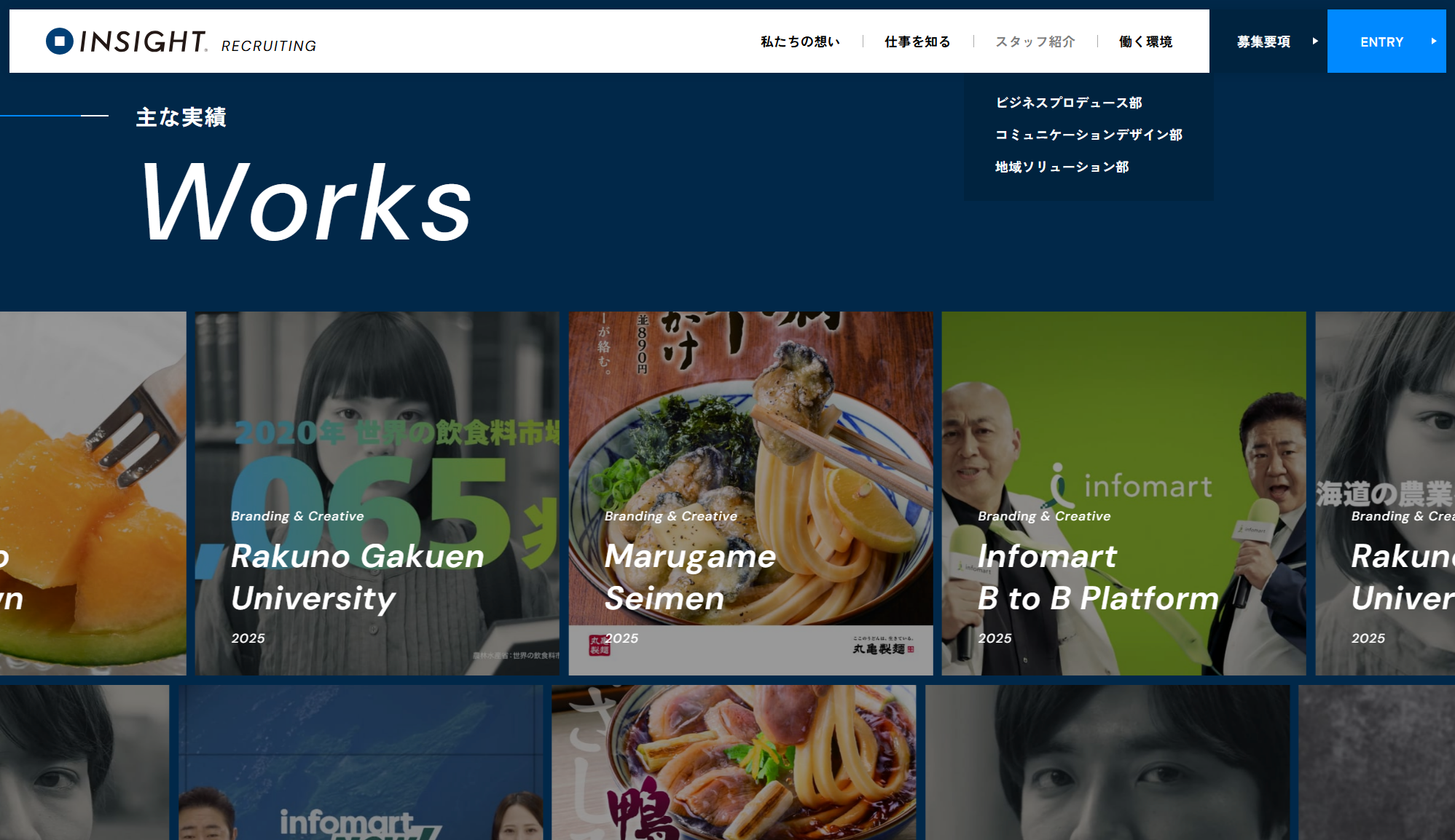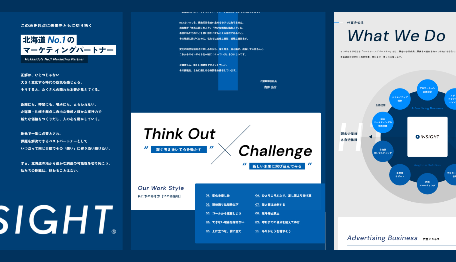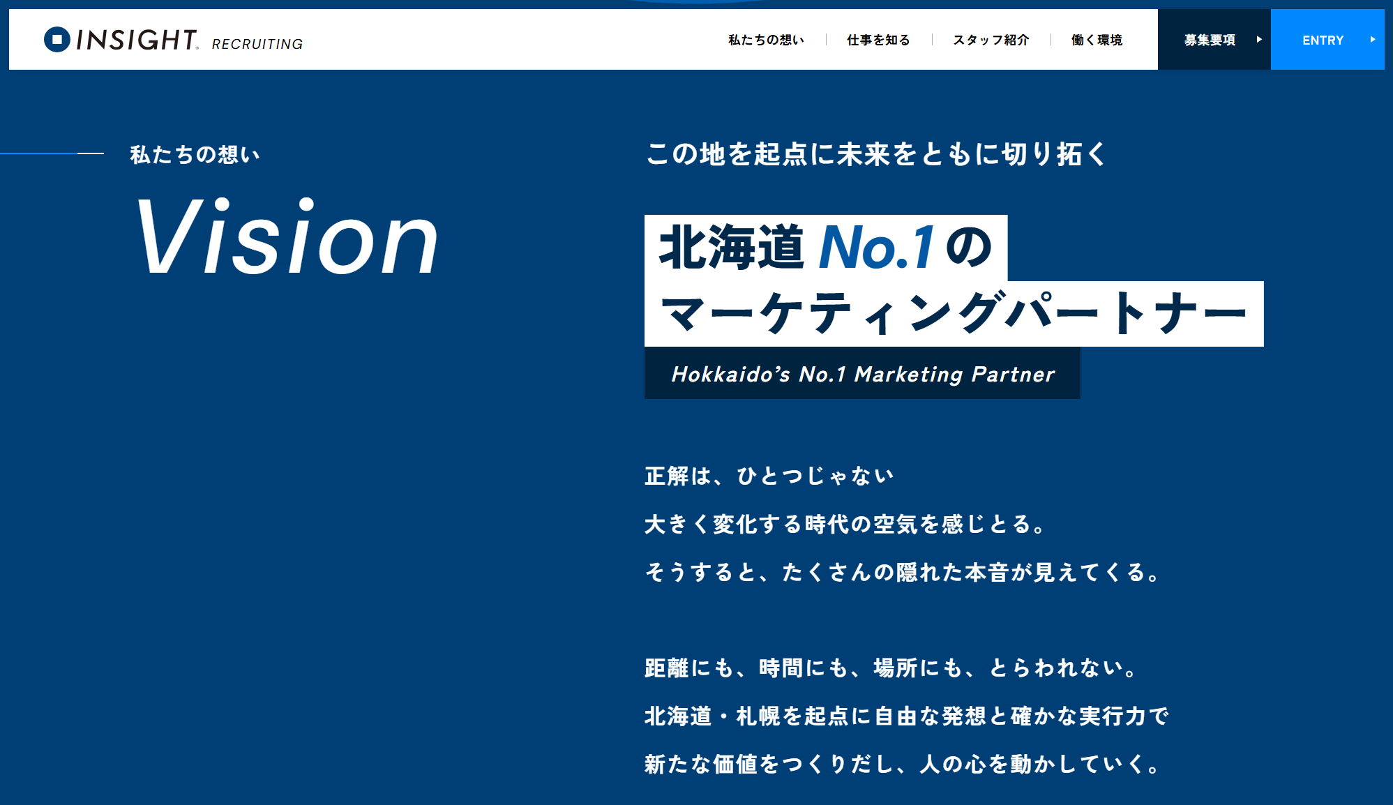 札幌を拠点に、地域密着型のマーケティングを展開する株式会社インサイト様の採用サイトリニューアルを担当しました。採用活動本格化を前に、新卒・キャリア両方の採用情報サイトを刷新するプロジェクトです。2025年に迎えた設立50周年を機に、パーパスやビジョン、ミッション、バリューをすでに策定されていましたが、それらがウェブサイトには反映されていませんでした。進化した事業の姿と、これから先へ向かう想いを、採用サイトを通じて求職者に届けることを目指しました。