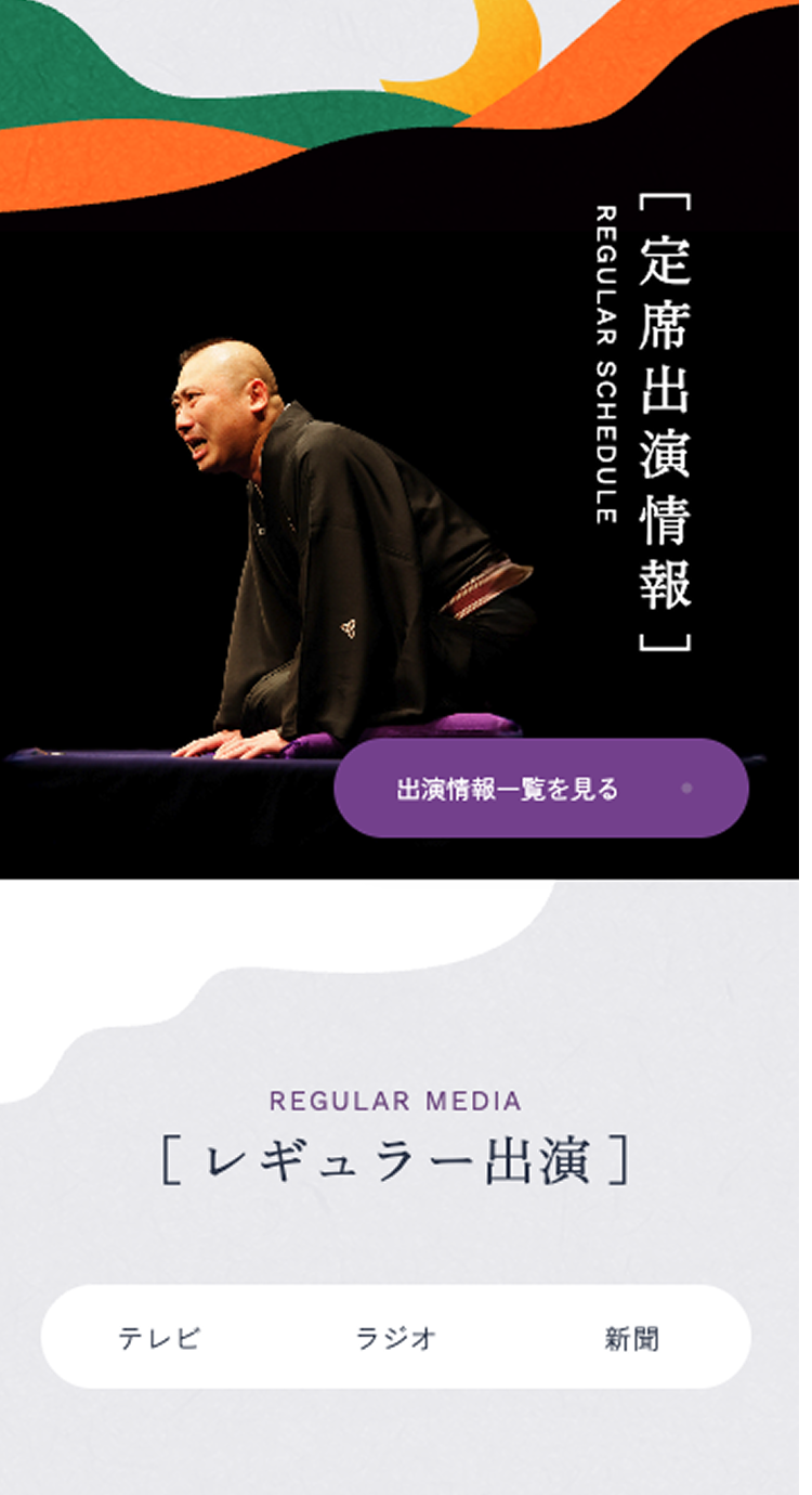 デザインは、桂宮治様の明るくエネルギッシュな人柄を表現する色合いを採用し、伝統のイメージに寄りすぎず、親しみやすい雰囲気を目指しました。見る人にも運営する人にもやさしい、公式サイトとしての機能性と温かみのある世界観を表現しました。