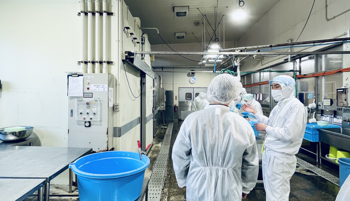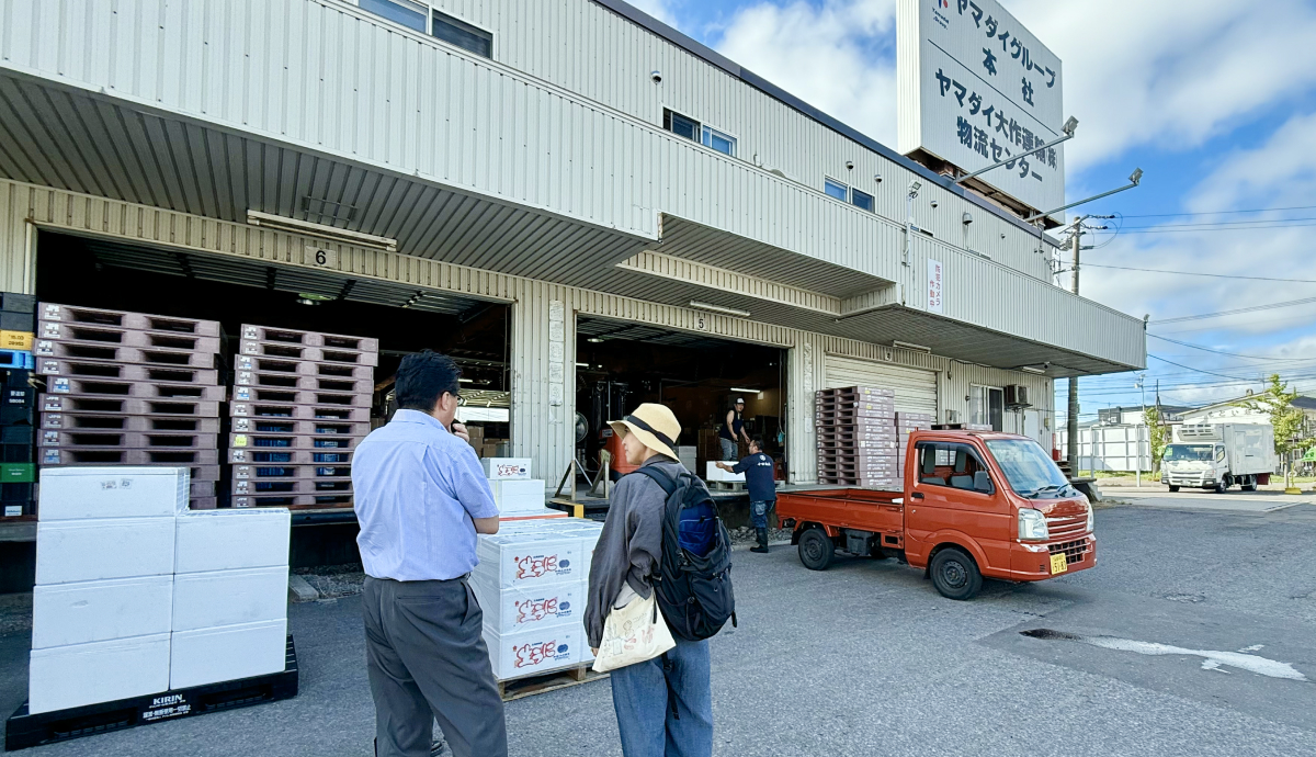 まずは7つの事業のうち、創業の地・函館を中心に展開されている事業の現場を視察するところからスタートしました。水産卸売市場の作業請負を行う函市作業組、運送業のヤマダイ大作運輸、水産加工の山大を訪れ、社員の方に案内いただきながら事業内容を理解していきました。